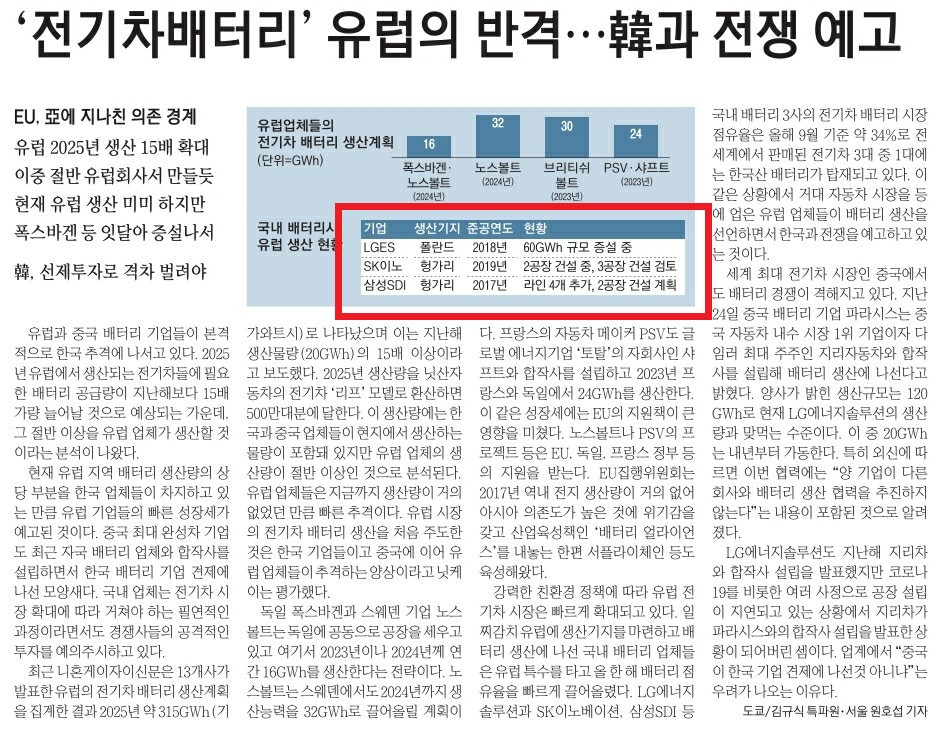'20년 12월말에 발행된 본 기사의 내용을 요약하면 EU는 배터리 산업 분야에 지나치게 아시아에 의존하는 것을 경계하여 '25년까지 유럽에서 생산되는 전기차에 필요한 배터리 공급이 지난해보다 15배가량 늘어날 것으로 예상되는 가운데 이중 절반은 유럽 회사에서 만들도록 하겠다는 분석이다. 현재는 유럽 지역 배터리 생산량의 상당 부분을 한국 업체들이 차지하고 있고 유럽 업체들의 생산량이 미미한 수준이나 '폭스바겐' 등 대표 메이커 업체를 중심으로 아시아 업체들을 바짝 추격하겠다는 것이다.