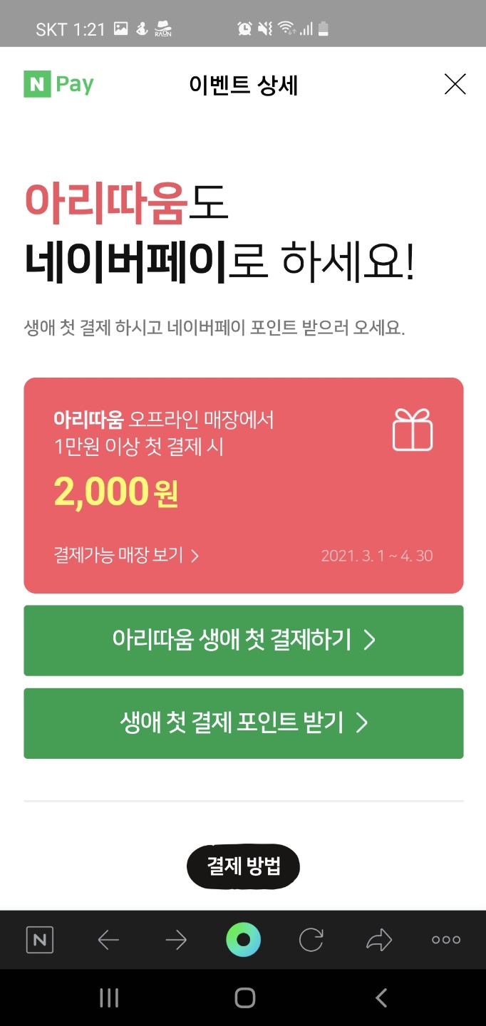 현장 결제 중 지금 나에게 쓸모 있는 것은 바로 이니스프리와 아리따움 현장 첫 결제시 2천 원 적립 이벤트이다. 안 그래도 사용하던 기초 화장품을 다 써 가던 차에 1만 원 이상만 구매하면 2천 원을 돌려주니 집 근처 매장을 지날 때 유용하게 사용하여야겠다.