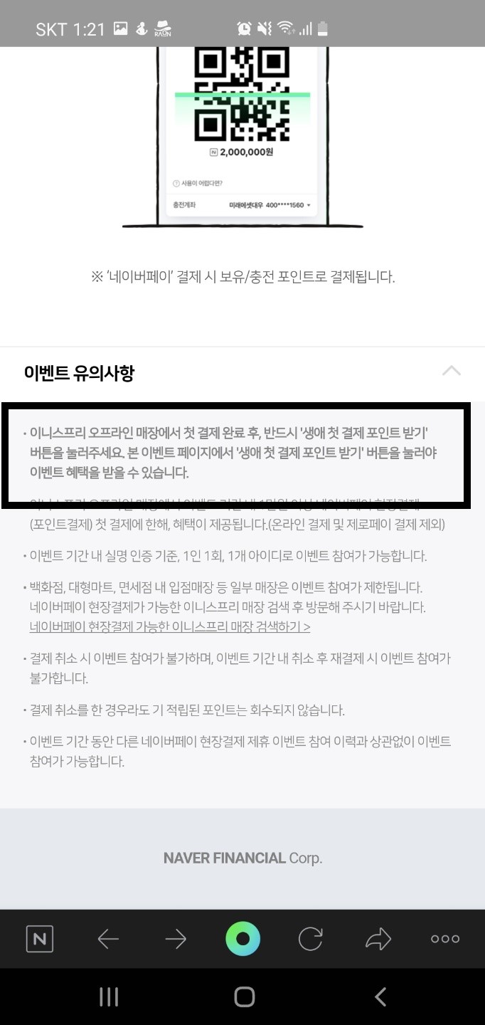 현장 결제 방법은 그냥 앱을 눌러 나오는 바코드를 찍어주면 되는데, 생애 첫 결제 포인트를 받기 위해서 잊지 말아야 할 것은 오프라인 매장에서 결제 완료 후 '생애 첫 결제 포인트 받기' 버튼을 눌러주어야 혜택이 적용 된다는 것이다. 네이버 페이에서 이벤트 사항을 공지하면 아래 작은 글씨로 <이벤트 유의사항>을 적어주는데 어떤 이벤트든 한번 읽어 보는 것이 좋다.