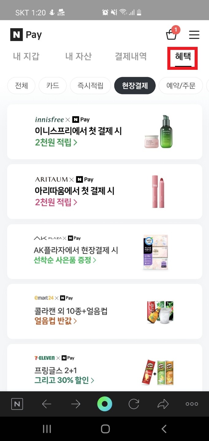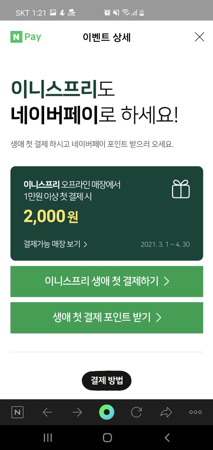 네이버 페이 이니스프리/아리따움 현장 결제 이벤트 (편의점 이벤트 등)