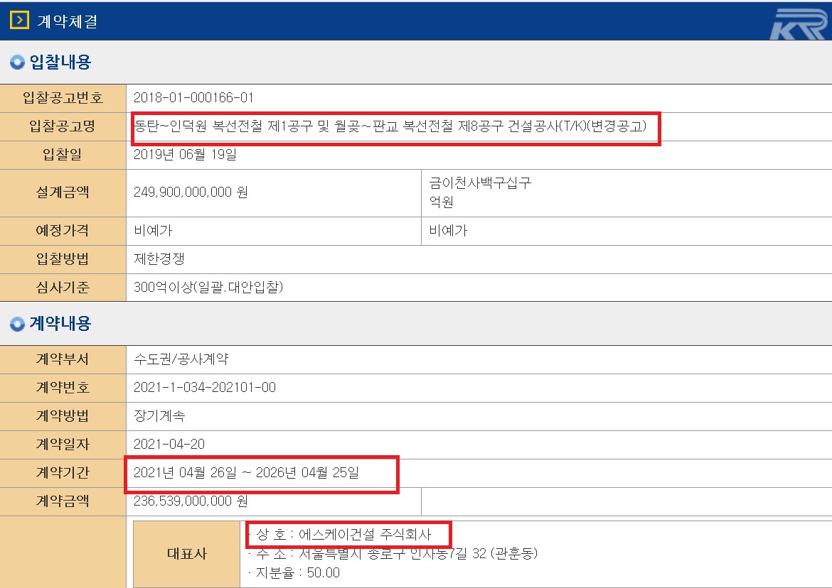<인동선, 월판선 건설 공사 계약 체결 내용>
