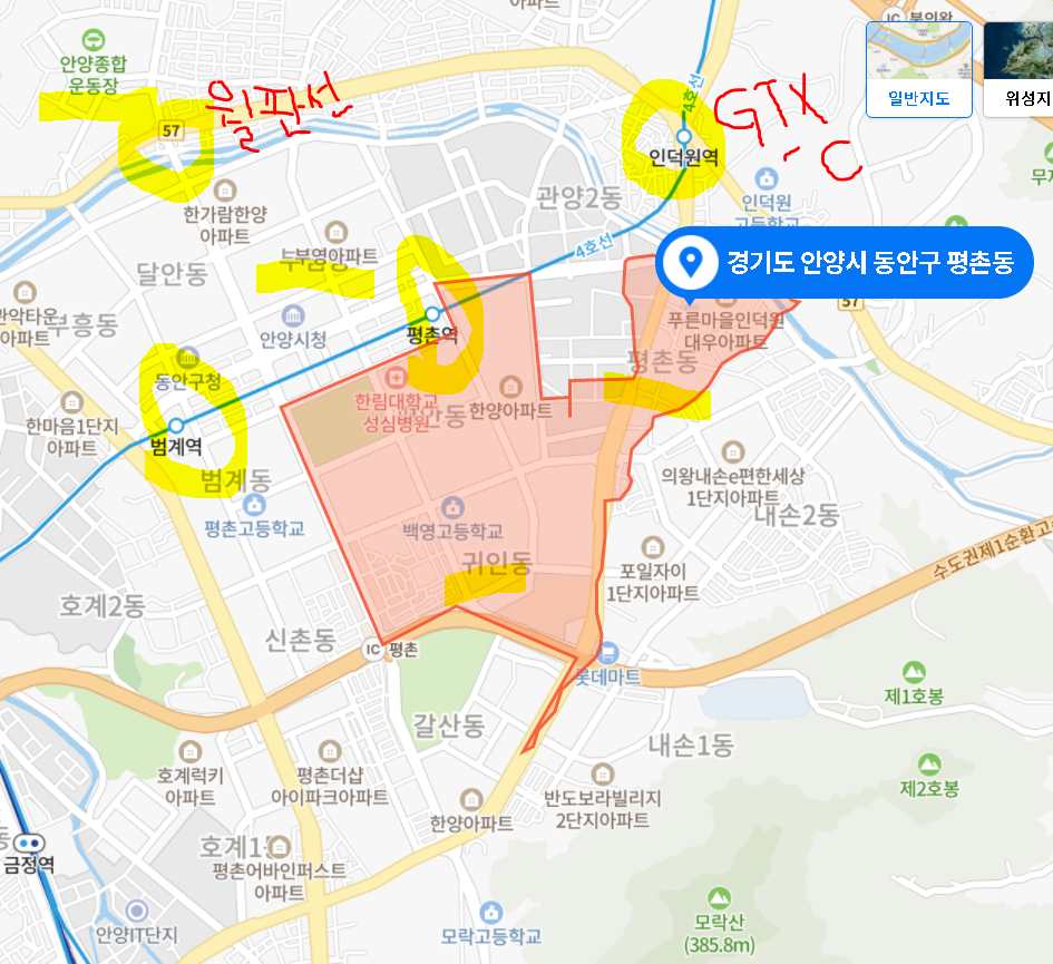 특히, 안양 동안구 평촌동 지역의 상승률이 높다는데 같은 동안구의 바로 옆동네가 4호선 평촌역과 범계역을