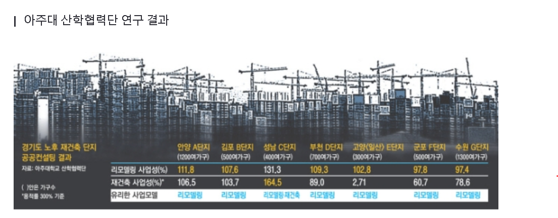 안양(평촌), 김포, 성남(분당), 부천, 고양(일산) 1기 신도시 5개 도시 중 분당 1곳을 제외하곤 모두 리모델링이 유리하다는 평으로 아래와 같이 기사화도 되었다.