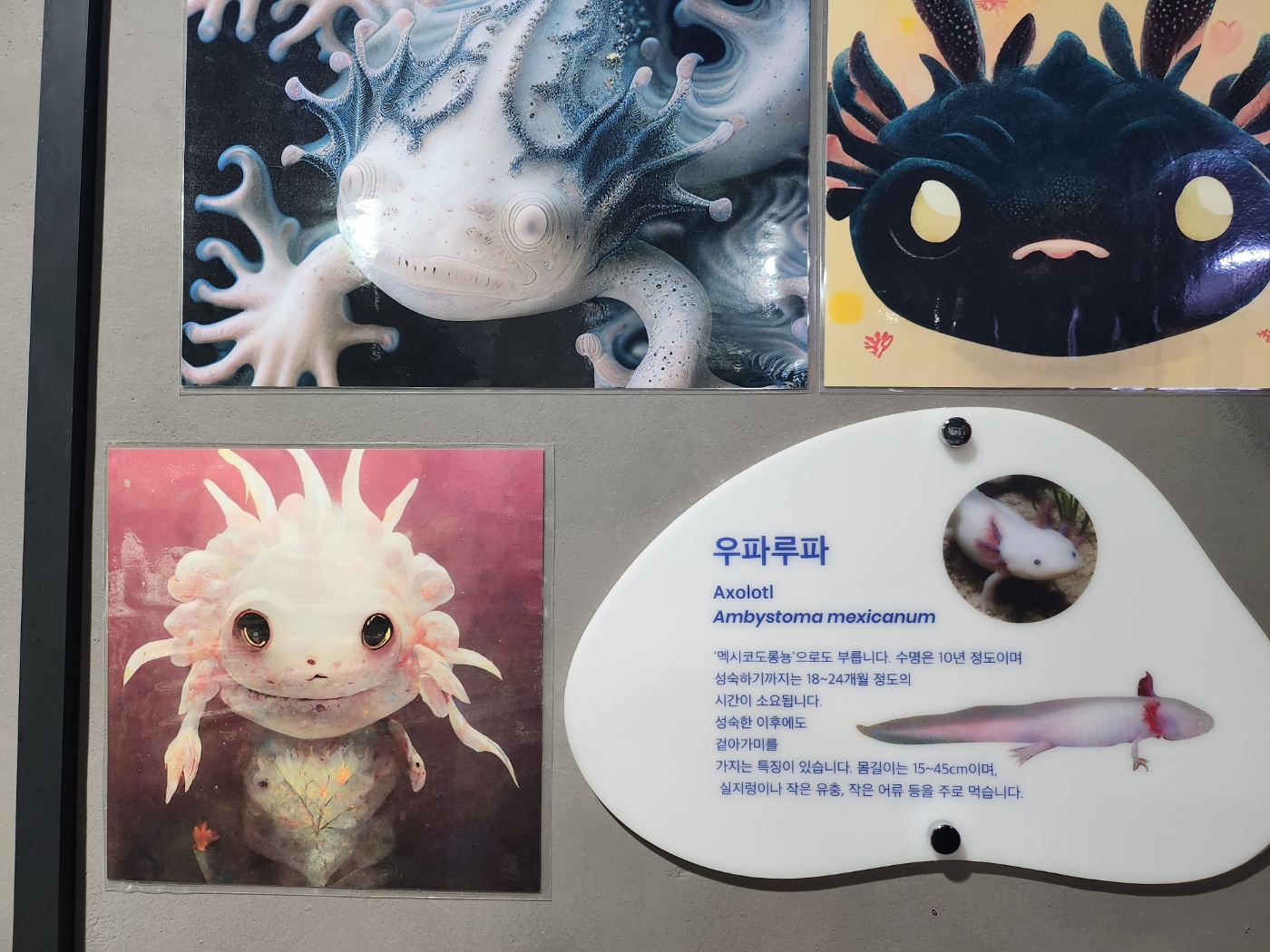 우파루파는 동그란 이미지와 성숙한 이후에도 가지는 저 겉아가미 때문에 동글동글하고 말랑말랑한 것이 얼굴 주변을 감싸 뭔가 귀엽고도 신비로운 느낌을 주는 것 같다. 이름도 '우파루파'라니 뭔가 도래미파 같이 발음하기가 귀엽다. 반면, 지능도 높은 저 태평양대문어는 저 좁은 공간에서 얼마나 답답할까 하는 생각도 했다. 실제로 가서 보면 직사각형태의 수족관 유리 벽면의 두 곳을 큰 빨판으로 붙어 차지하고 있을 정도로 거대하고 움직임이 없다. 실제 저 문어의 마음은 알 방법이야 없지만, 어쩌다 운 없이 잡혀와 하고 많은 곳 중 여기 대전 아쿠아리움의 좁디좁은 수족관에 터를 잡는 것보단, 다소 위험하더라도 드넓은 태평양에서 보호색에 따라 변신하며 살고 있는 쪽이 더 낫지 않았을까.