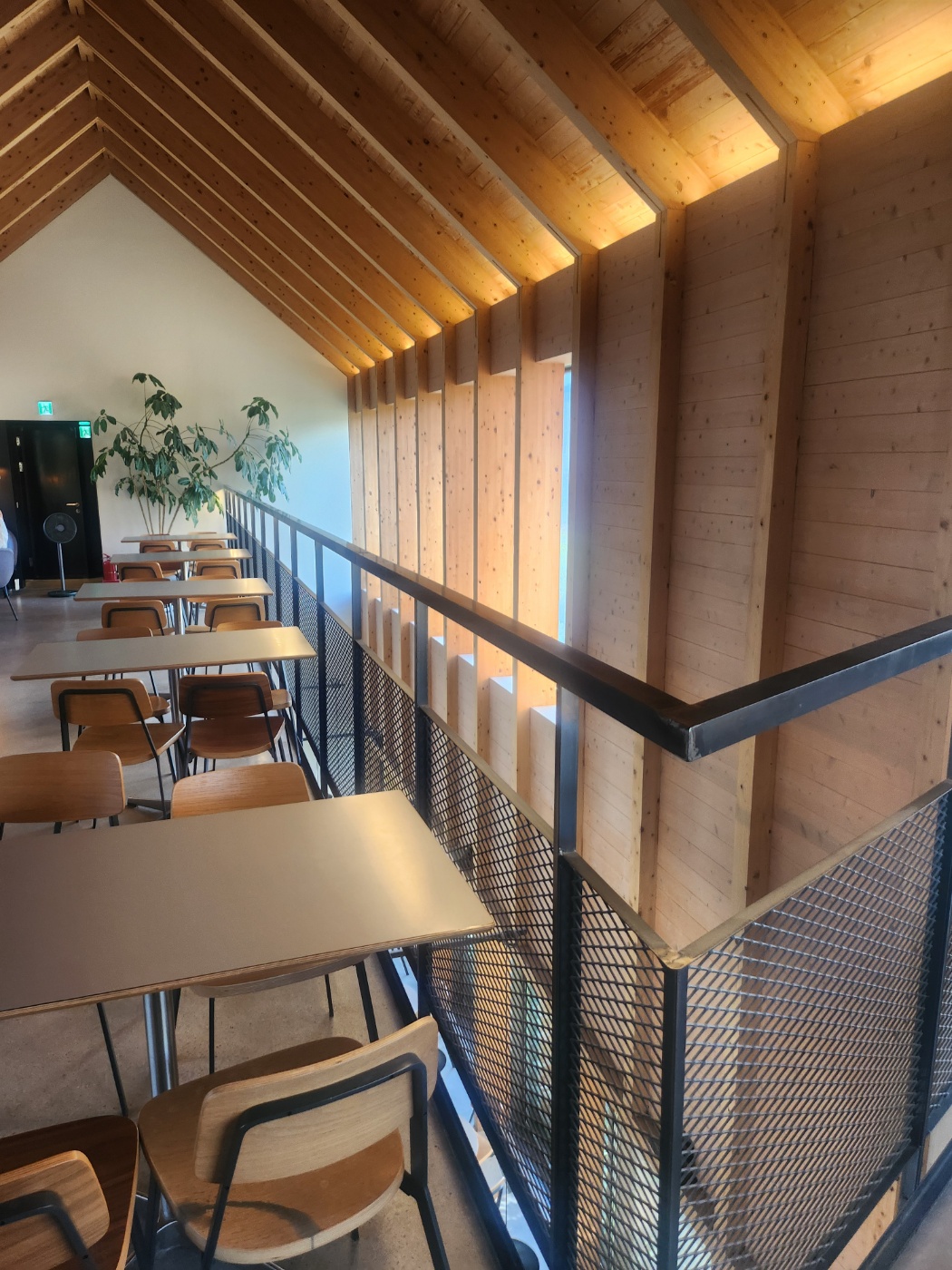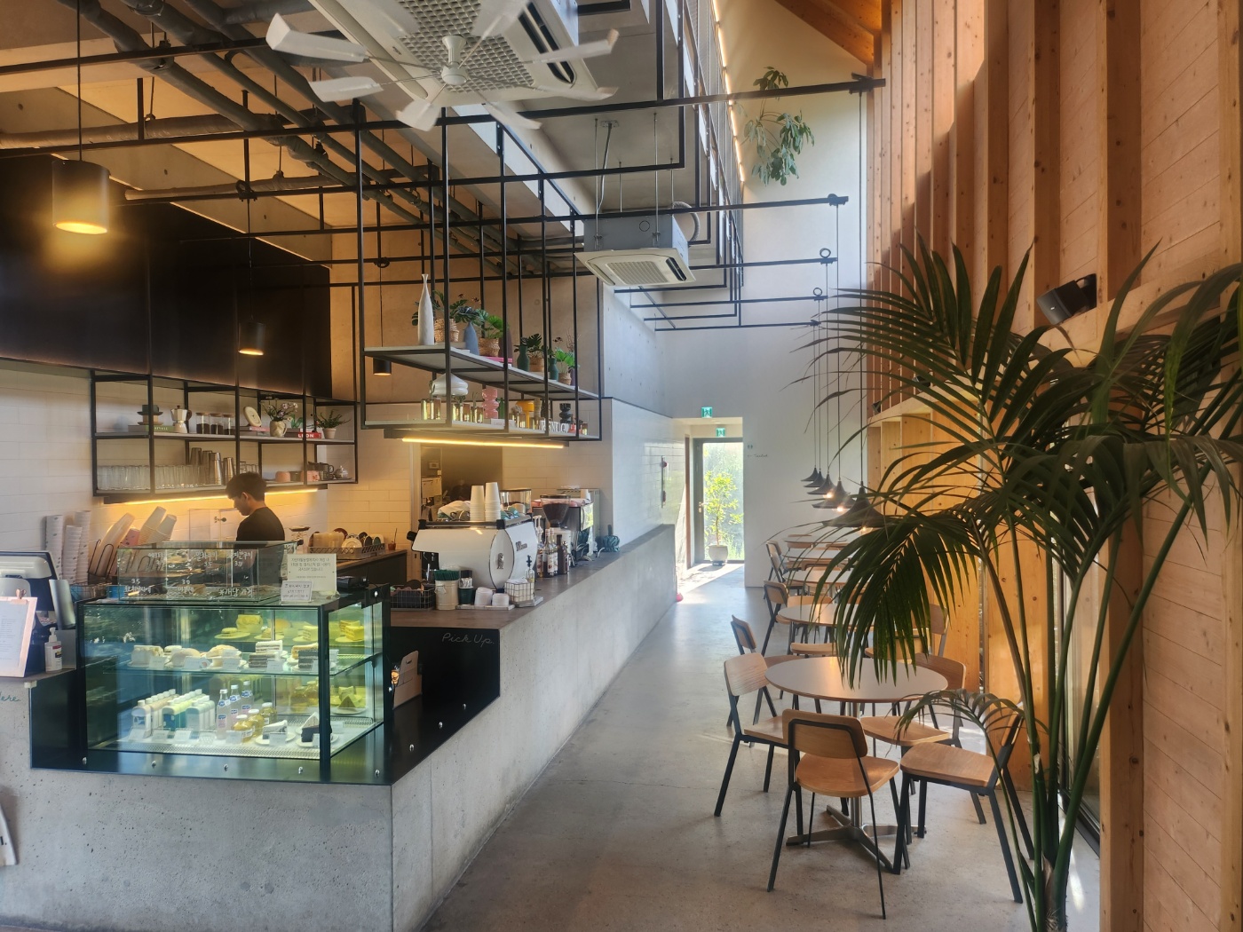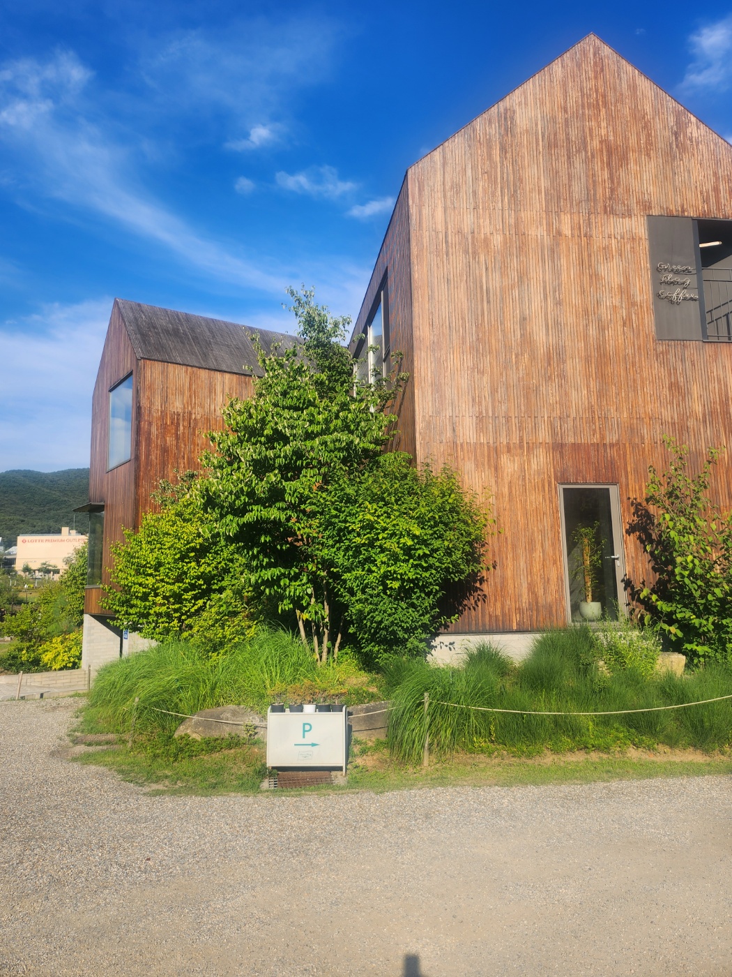 먼저 건물외관은 전반적으로 우드로 되어 있고 뾰족하고 높게 좋은 지붕이 인상적이다. 그래서 마치 초록들판이 펼쳐진 목장에 있는 건물에 놀러 온 것 같은 느낌이 들었다. 카페 안에서도 이 높게 솟은 층고로 인해 답답하지 않은 느낌이 든다.