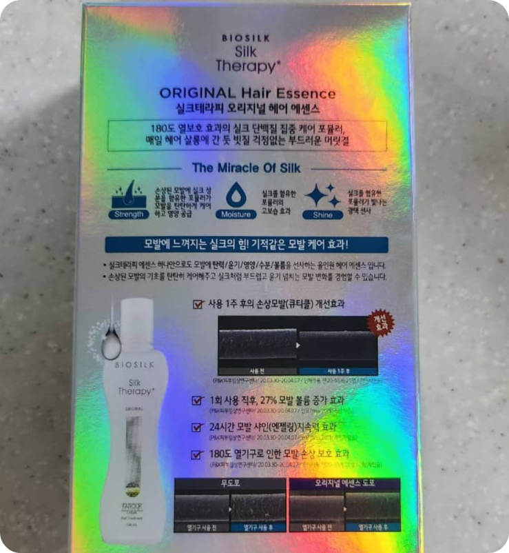 다른 제품들과 차이점이라면 다른 제품들은 나가기 직전에 헤어에 도포해 주면 모발을 보호해 주는 정도의 느낌이었는데 실크 테라피는 제 기준으론 외출 직전에 사용하기에는 좀 무거운 감이 있으나, 자기 전 샤워 후 약간 젖은 머리에 도포해 주고 잘 말리고 자면 무슨 영양제를 바른 듯 다음날 아침 정말 부드러운 머릿결을 체험해 볼 수 있는 차이가 있습니다. 손으로 만졌을 때도 한결 부드러워진 머릿결에 놀랐고 빚질도 굉장히 잘 됐습니다.