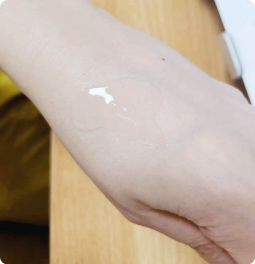 실크테라피 헤어 에센스를 손에 적당량을 덜어서 보면 투명하지만 굉장히 찰지고 쫀득한 재형입니다. 그냥 묽은 에센스보다는 쫀쫀하게 점성이 있으면서도 부드럽게 발리는 형태라 제대로 에센스를 투여해 준 듯하여 저는 더 맘에 들었습니다.