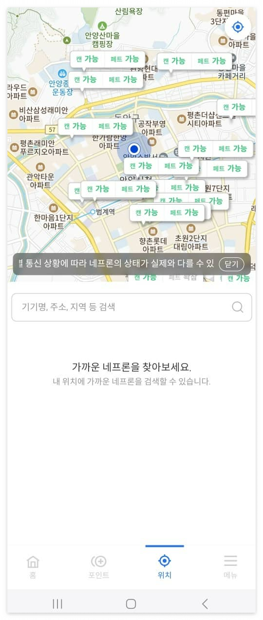 수퍼빈 앱을 설치한 후 안내에 따라 회원가입을 해준다. 그리고 아래 메뉴 중에 '위치'를 클릭하면 내 주변에 네프론 기계 설치 지역과 패드와 캔 수거 가능여부를 알려준다.