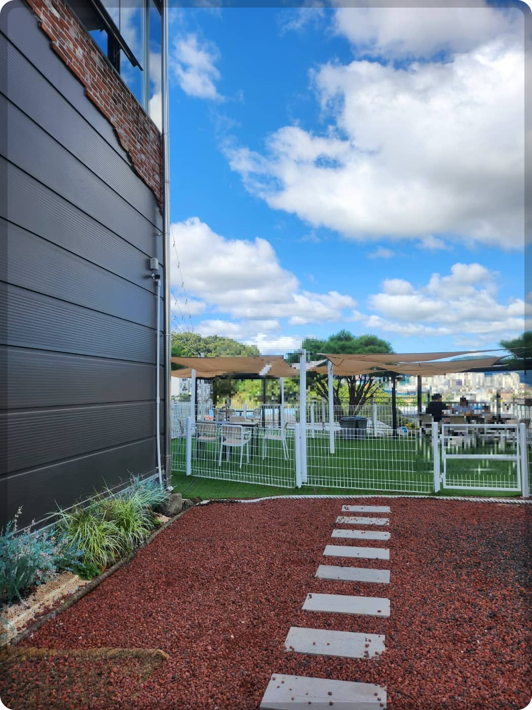 매장 안도 넓지만 바깥쪽 테라스에도 붉은 돌들을 깔아 놓고 네모난 석판으로 징검다리처럼 길을 만들어 놓았으며, 곳곳에 푸른 나무나 식물, 그리고 적적하게 나무 벤치가 자리하고 있어 밖에서 야외에 온 듯 브런치나 티 한잔을 즐기기 좋게 만들어 놓았다.